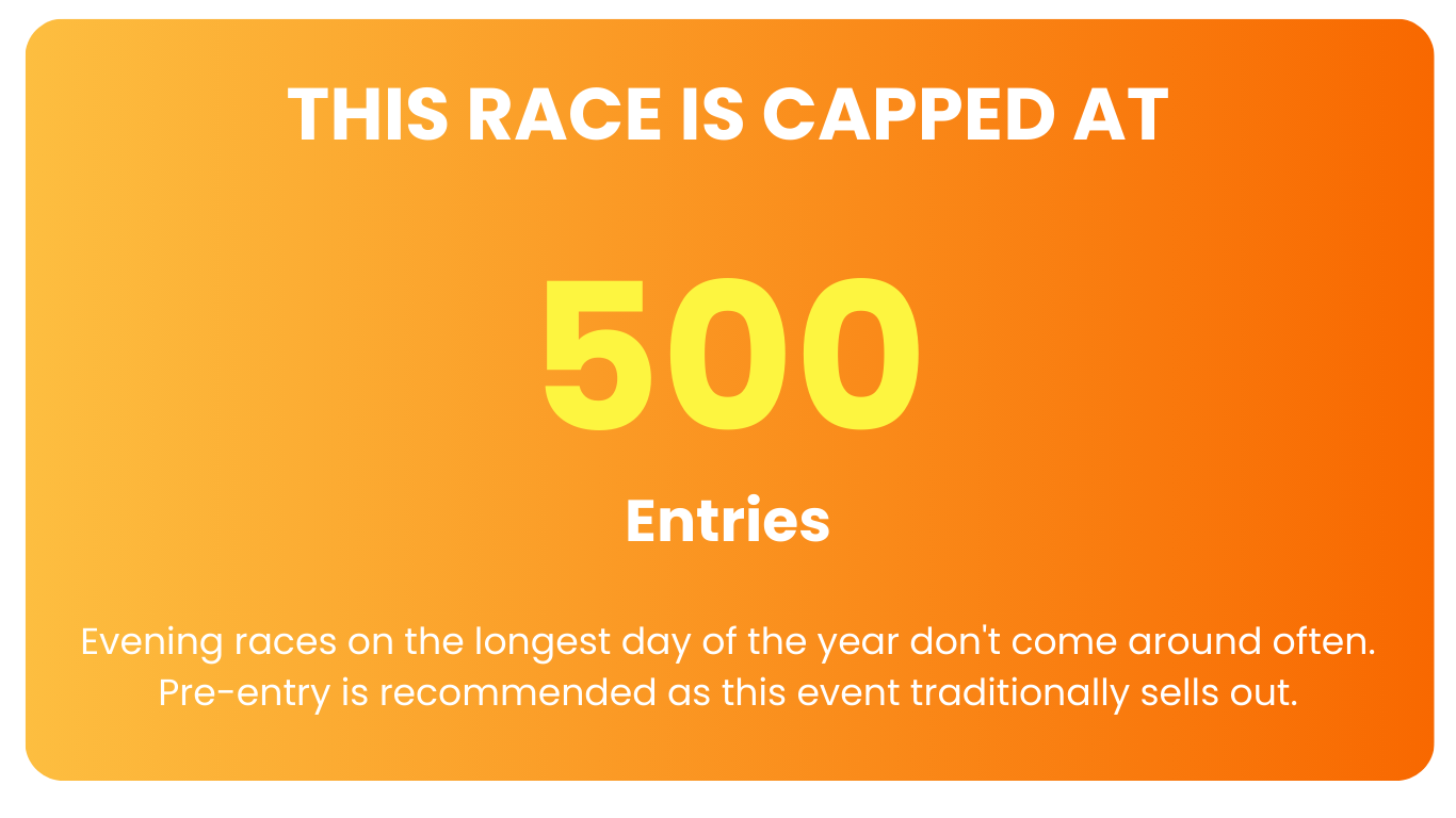7pm start means you're running in perfect evening light. Sunset doesn't hit until after 9pm in June – you'll finish bathed in that golden summer glow.